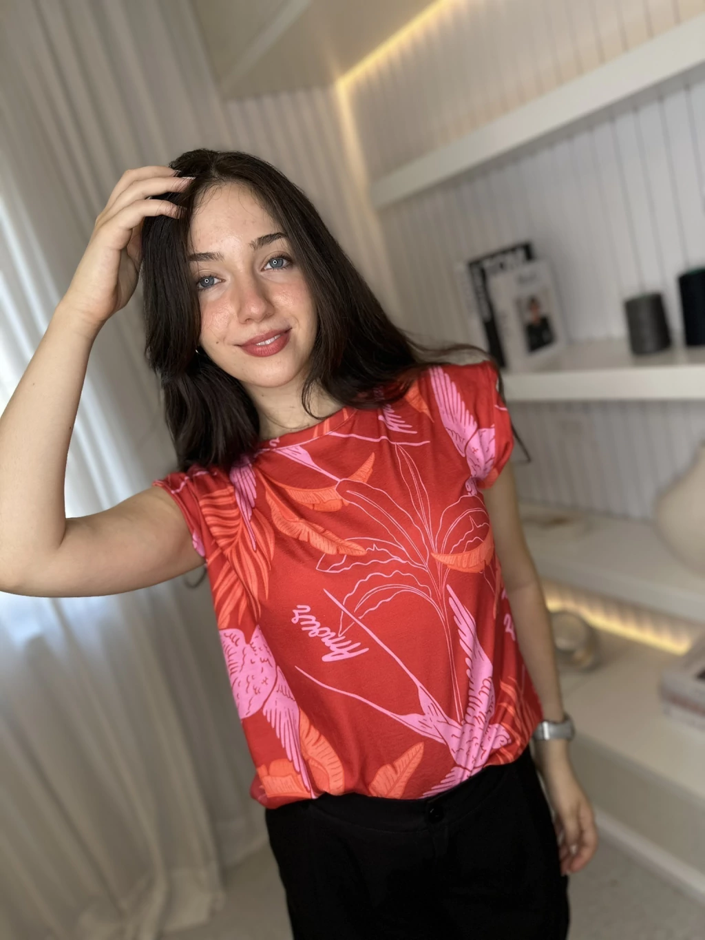Esta musculosa de algodón es pura energía: con un fondo rojo intenso y dibujos de pájaros, hojas y la palabra ‘amour’ en tonos naranjas, rosas y fucsias. Súper liviana y colorida, es perfecta para darle un toque alegre y fresco a tus días.